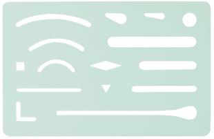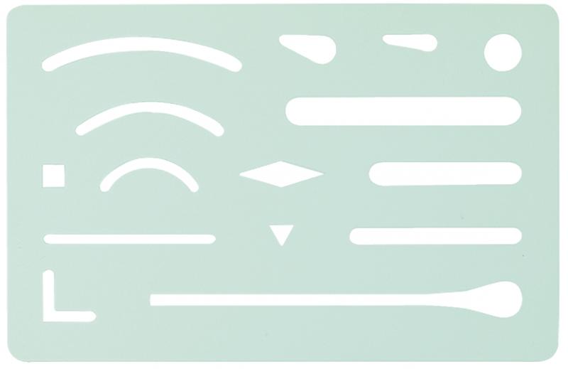 Radierschablone aus rostfreiem, 0,1 mm dünnem Feder-bandstahl. Größe: 93 x 60 mm.