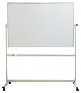 Stativdrehtafel. Oberflächenbeschaffenheit: emailliert (e3). Beidseitig beschreibbar. Beschreibung der Besonderheiten: die horizontale Drehachse ist um 360° schwenkbar und stufenlos arretierbar. Material des Rahmens: Metall. Farbe des Rahmens: lichtgrau. Ablageschale vorhanden. Typbezeichnung der Stativform: Zweibeinstativ, 188 cm hoch. Ausführung des Fußes: Zweiarmfuß mit 4 Rollen, 67 cm tief. Lenkrollen feststellbar. Größe (B x H): 120 x 90 cm. Farbe: weiß.