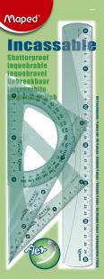 Artikelbeschreibung:Geometrie-Set Maxi Flex, bruchfest, 4-teilig aus Kunststoff, Skalenaufdruck mit UV-beständiger Farbe, Inhalt: je 1 x Lineal 300 mm, Zeichendreieck 60 Grad 210 mm, Zeichendreieck 45 Grad 210 mm, Winkelmesser 180 Grad 120 mm, farbig sortiert in blau- und grün-transparent