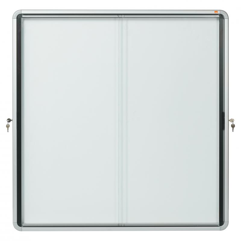 Artikelbeschreibung:nobo Schaukasten für den Innenbereich. Magnetisch. Mit platzsparenden, abschließbaren Schiebetüren. Für 12x DIN A4. Mit magnetischer Metallrückwand. Für die Verwendung von Magneten und trocken abwischbaren Markern. Mit 2 Sicherheitsschlössern. Nutzbare Tiefe: 16 mm. Einzigartige Haltewinkel ermöglichen eine einfache Montage. Lieferung inklusive Montageset und 2 Schlüsseln. Material Rahmen: Aluminium. Material Tür: Sicherheitsglas, 4 mm. Format: 1000 x 972 x 54 mm. Farbe: weiß.