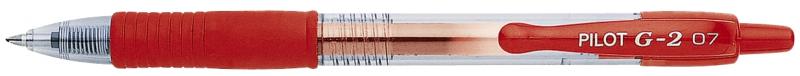 Artikelbeschreibung:Gelschreiber G2-7. Mit Druckmechanik und auswechselbarer Mine Art.Nr. 2606. Spitze aus Edelstahl mit Karbidkugel. Gefüllt mit Geltinte. Schaft und Clip aus Kunststoff. Gummierte Griffzone. Clip, Druckknopf und Griffzone in Schreibfarbe. Strichstärke: 0,4 mm. Schreibfarbe: Rot. Schaftfarbe: transparent.