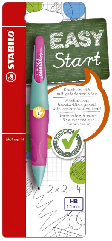 Artikelbeschreibung:Ergonomischer Druckbleistift STABILO EASYergo 1.4 für fortgeschrittene Schreibanfänger ab 8 Jahren. Ausführung: Spitze voll versenkbar, Mine auswechselbar, Mine federnd gelagert, Druckmechanik. Material des Schaftes: Polypropylen. Ausführung der Griffzone: aus rutschfestem Material. Mit Namensschild. Farbe des Schaftes: türkis/neonpink. Stärke der Mine: 1,4 mm. Bezeichnung der Härte: HB. Ausführung des Inhalts mit Packung: Blisterkarte mit 1 Stift + 3 Nachfüllminen (Linkshänder).