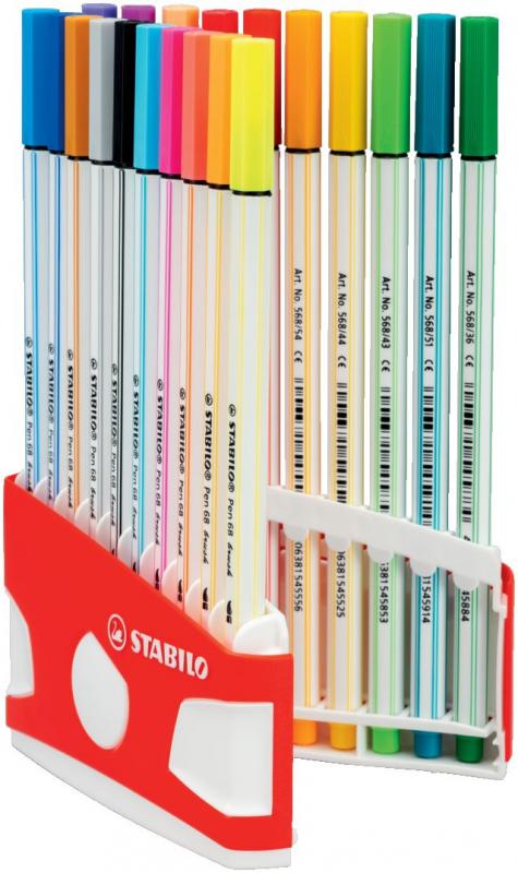 Artikelbeschreibung:Premium-Filzstift mit Pinselspitze STABILO Pen 68 brush ColorParade. Material des Schaftes: Kunststoff. Farbe des Schaftes: weiß mit Kantenstreifen in Schreibfarbe. Bezeichnung der Schreibflüssigkeit: Tinte auf Wasserbasis. Die flexible Pinselspitze für Anfänger und Fortgeschrittene ermöglicht einen fließenden und präzisen Wechsel zwischen feinen und breiten Linien. Ideal für DIY-Anwendungen wie Hand Lettering und Bullet Journaling. Nass aquarellierbar und mischbar. Strichstärke: variabel. Schreibfarbe von Schreibgeräten: sortiert. Ausführung des Inhalts mit Packung: Kunststoff-Klappbox, für die gezielte Entnahme einzelner Farben, in rot/weiß mit 20 Stiften.