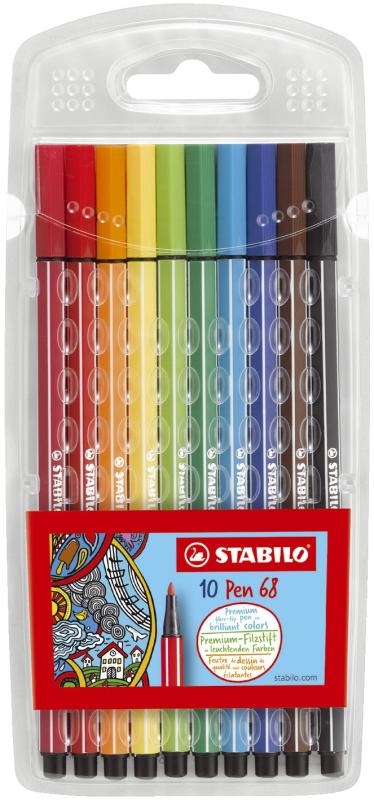 Artikelbeschreibung:Fasermaler STABILO Pen 68 Etui. Material des Schaftes: Kunststoff. Farbe des Schaftes: in Schreibfarbe mit weißen Kantenstreifen. Ausführung: Rundspitze, Spitze druckgesichert. Art der Schreibflüssigkeit: pigmentierte Universaltinte auf Wasserbasis, geruchsneutral. Farbintensiver Premium-Fasermaler für kräftige Linien und deckende Flächen, ausgesuchte Farbstoffe von hoher Brillanz und Leuchtkraft. Strichstärke: 1 mm. Schreibfarbe von Schreibgeräten: sortiert. Ausführung des Inhalts mit Packung: Kunststoffetui mit 10 Farben, Klappöffnung für schnelle Stiftentnahme.