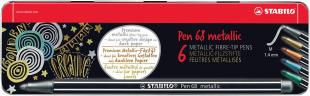 Artikelbeschreibung:Premium-Filzstift STABILO Pen 68 metallic. Material des Schaftes: Kunststoff. Farbe des Schaftes: schwarz mit weißen Kantenstreifen. Kappe und Endstopfen in Schreibfarbe. Ausführung: Filzspitze, Spitze druckgesichert. Art der Schreibflüssigkeit: Tinte auf Wasserbasis, geruchsneutral. Metallisch-schimmernde Farben mit hoher Deckkraft auf weißem und farbigem Papier oder Karton. Die robuste M-Spitze sorgt für gleichmäßige Farbabgabe. Ventilierte Kappe - am Stiftende aufsteckbar. Strichstärke: 1,4 mm (M). Schreibfarbe von Schreibgeräten: Silber (2x), Gold (1x), Kupfer (1x), metallic Blau (1x), metallic Grün (1x). Ausführung des Inhalts mit Packung: Metalletui mit 6 Stiften (im OPP-Bag).
