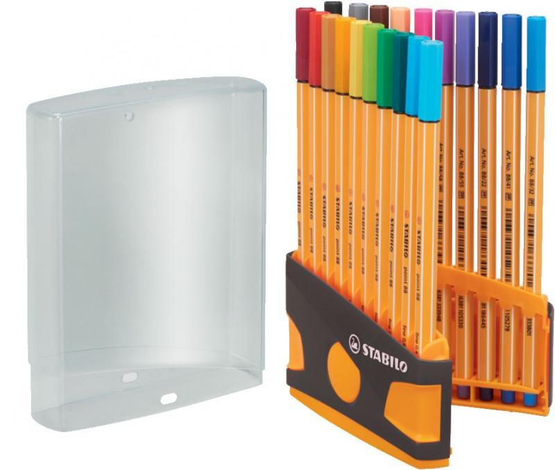 Artikelbeschreibung:Fineliner STABILO point 88 ColorParade. Typbezeichnung der Mine: Faserspeicher. Ausführung Spitze: metallgefasste Spitze, 0,4 mm, geeignet für Schablone. Art der Schreibflüssigkeit: Tinte auf Wasserbasis, sortiert, lichtbeständig gegeben. Kann einige Tage offen liegen bleiben, ohne einzutrocknen. Kappe am Stiftende aufsteckbar. Ausführung der Griffzone: Kunststoff. Farbe der Kappe: in Schreibfarbe. Farbe des Schaftes: orange mit weißen Kantenstreifen. Ausführung des Inhalts mit Packung: Kunststoff-Klappbox, für die gezielte Entnahme einzelner Farben, in anthrazit/orange mit 20 Stiften.
