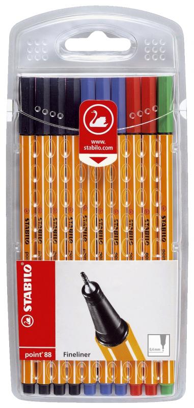 Artikelbeschreibung:Fineliner STABILO point 88 Etui. Typbezeichnung der Mine: Faserspeicher. Ausführung Spitze: metallgefasste Spitze, 0,4 mm, geeignet für Schablone. Art der Schreibflüssigkeit: Tinte auf Wasserbasis, grün, rot, blau, schwarz, lichtbeständig gegeben. Kann einige Tage offen liegen bleiben, ohne einzutrocknen. Kappe am Stiftende aufsteckbar. Ausführung der Griffzone: Kunststoff. Farbe der Kappe: in Schreibfarbe. Farbe des Schaftes: orange mit weißen Kantenstreifen. Ausführung des Inhalts mit Packung: Etui mit 10 Stiften.