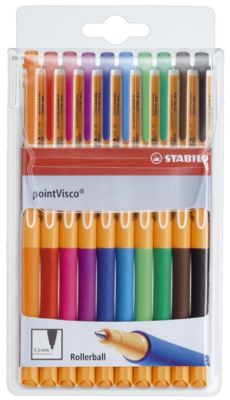 Artikelbeschreibung:Tintenroller STABILO pointVisco Etui. Ausführung der Vorschubmechanik: Kappenmodell. Typbezeichnung der Mine: Tintenrollermine. Art der Schreibflüssigkeit: low-viscosity Geltinte. Ausführung Mine: Metallspitze, 0,5 mm, sortiert. Kann einige Tage offen liegen bleiben, ohne einzutrocknen. Ausführung Stift: Kunststoff mit rutschfester Griffzone und praktischem Clip. Neue Gelformel. Farbe des Schaftes: in Schreibfarbe-orange mit weißen Streifen. Ausführung des Inhalts mit Packung: Etui mit 10 Stiften.