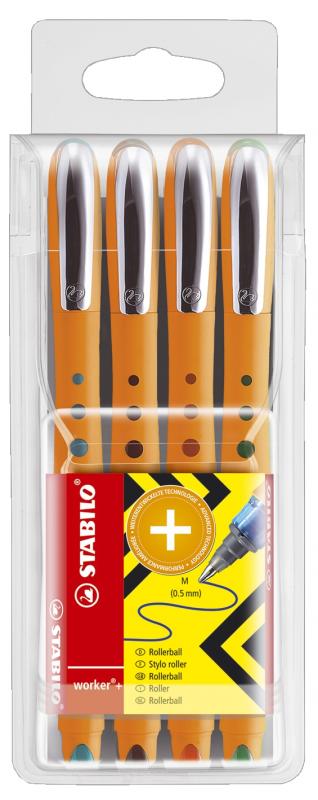 Artikelbeschreibung:Tintenroller STABILO worker medium Etui. Kappenmodell. Typbezeichnung der Mine: Tintenrollermine. Art der Schreibflüssigkeit: Tinte auf Wasserbasis. Ausführung Mine: Edelstahlspitze für ein extrem sanftes Schreibgefühl. Die unverwüstliche Spitze gleitet rasant über das Papier, 0,5 mm, blau, rot, grün, schwarz. Kann einige Tage offen liegen bleiben, ohne einzutrocknen. Tintenspeicher-Technik: Free Ink System. Ausführung Stift: rutschfeste Oberfläche aus Polypropylen, im ergonomischen Design. Material des Clips: Metallclip. Mit Tintenstandkontrolle. Farbe des Schaftes: orange. Ausführung des Inhalts mit Packung: Kunststoffetui mit 4 Stiften.