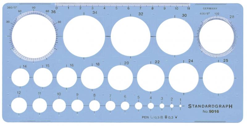 STANDARDGRAPH 9016 Schablone mit 25 Kreisen Ø 1 - 36 mm. Format 200 x 100 mm.